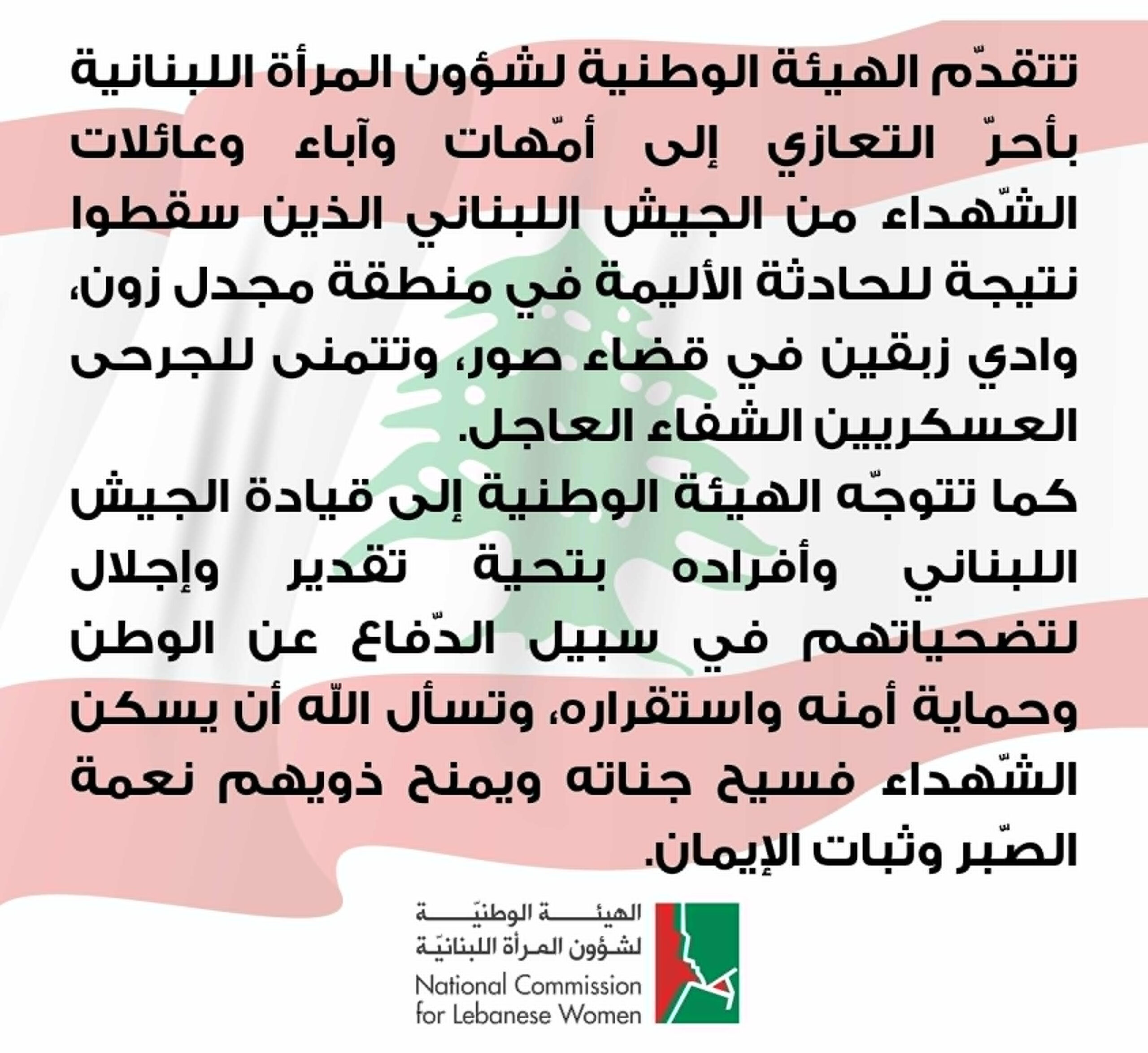 تتقدّم الهيئة الوطنية لشؤون المرأة اللبنانية بأحرّ التعازي إلى أمّهات وآباء وعائلات الشّهداء من الجيش اللبناني الذين سقطوا نتيجة للحادثة الأليمة في منطقة مجدل زون، وادي زبقين في قضاء صور، وتتمنى للجرحى العسكريين الشفاء العاجل.